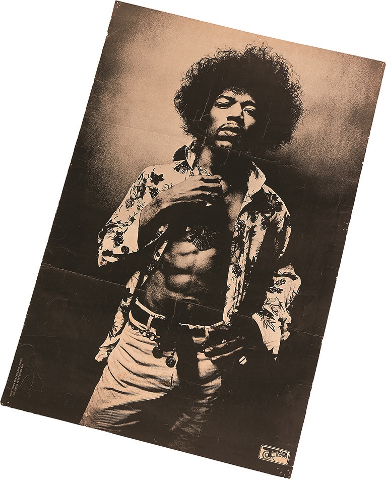 This tough to find poster depicts a marvelous image of Jimi from his original UK label Track Records of Pete Townsend fame. His rival at Woodstock. Poster has some pinholes and creasing, and measures 19" x 25".