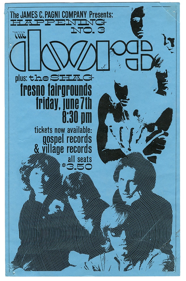 You see the handbill occasional available, but not this 16 x 10" poster. Containing fabulous imagery of the Lizard King and his mates, it's psychedelia all the way as sonic sound patterns and trippy "negative" imagery lead the way. Has some pinholes and minor creasing. Portions of this famous show were in the Doors documentary "Feast For Friends."