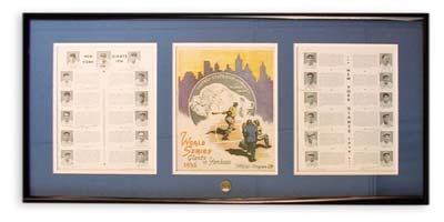 We love signed programs (especially World Series models) but they're not so great for display. Until now, that is. Savvy collector has framed the two inner pages with players' photos and EX-MT autographs along with the cover from the Subway Series event. A NRMT rare press pin from the event is set just below. A full twenty-five autographs include Terry, Hubbell, Jackson, Koenig, Ott and more. Nobody's missing. Matted and framed to muse-um quality. (18x36" framed)