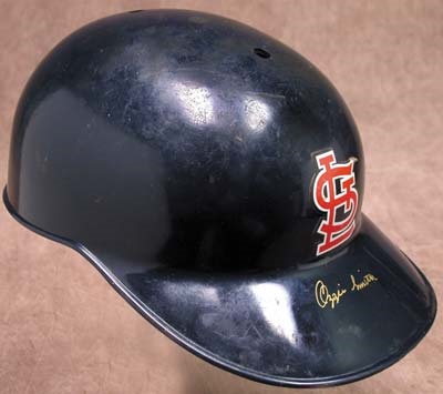 The Cardinals All-Star shortstop took this flapless relic to the plate during the height of his HOF career. Good use, with that sticky pine tar look that you want. "American Baseball Cap [size] 7." Number "1" in marker under visor. NRMT gold paint pen signature is on visor.