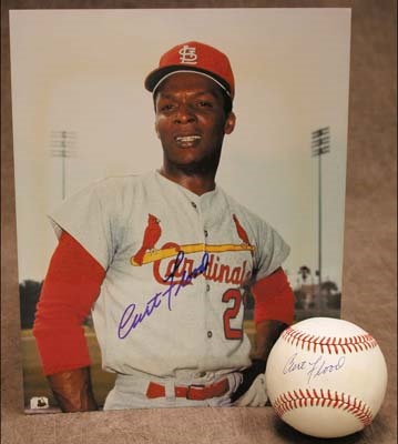Lot # 865: Curt Flood Single Signed Baseball & Photograph (8x10")
