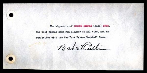 In 1941 Lenore France of the University of Illinois sent this 8.5x4" piece of letter writing paper with the typed legend, "The Signature of GEORGE HERMAN (Babe) RUTH, the most famous hone-run slugger of all time and an outfielder with the New York Yankee Baseball Team." [Capitalized words are in red.] He signed on the furnished typed line below with the Mint-est black "Babe Ruth" signature we have seen in a long time. The paper itself has neat binder holes with reinforcements and comes with its original envelope postmarked August 28, 1941 New York, New York. Lenore even added to the envelope, "Babe Ruth's Signature." This is more like a letter than just a signature.