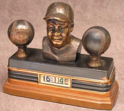 The finest example of this highly prized piece we have seen. Issued in the months following the Babe's death, this clock commemorates the biggest Yankee of all with a fine brass bust at center and flanking baseballs noting both his single-season and career home run records. Electric clock is below. Wood base. Tarnishing and very minor paint loss on gold trim are the only defects. Simply magnificent.