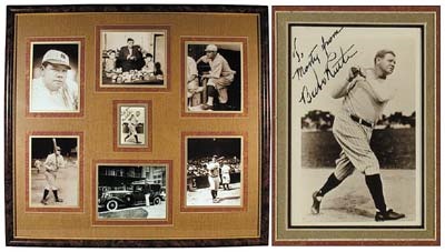 Magnificently bold inscription on this postcard-sized photo of the Babe is 9+/10, and reads, "To Monty from Babe Ruth." Museum quality matting and framing incorporates six 8x10" photos of the Babe (modern prints) to create a piece sure to capture the eye. 34x37" framed.