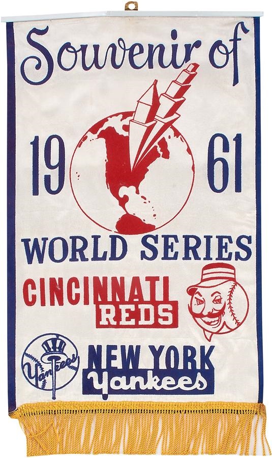 This classic banner was sold at World Series games during the 1961 Fall Classic between the Cincinnati Reds and New York Yankees. Made of silk and measuring 17x9.5", it contains the printing "Souvenir of 1961 World Series Cincinnati Reds New York Yankees" in blue and red ink on a white background. It remains in excellent condition with original yellow tassels at bottom and a metal hook for hanging. In that series, the Bronx Bombers completed a dominant season by taking the championship in five games.