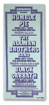 Recovering from the death of their lead guitarist Duane, The Allman Brothers went back on the road. This poster for their July 9th appearance in Memphis Tennessee is the only one we've ever seen for this show. It also announces shows by Humble Pie and Black Sabbath in Memphis. EX, unobtrusive staple holes.