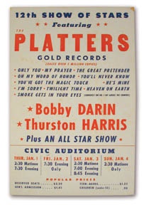 The 12th Annual Show of Stars Tour is 1959 was headlined by The Platters who followed up on their hits The Great Pretender, My Prayer and Only You with Smoke Gets in Your Eyes. It was number one in the country when this show took place in January of 1959. Other performers listed are Bobby Darin and Thurston Harris plus an All Star Show. Likely other participants according to a tour program are Clyde McPhatter, Fabian, Duane Eddy, Little Anthony and the Imperials, and Bo Diddley but since the shows varied a bit from city to city we can't be certain. EX, bruised corner and light aging.