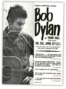 On the evening of April 12, 1963 some 900 hip souls attended Bob Dylan's first solo concert at a major New York venue, Town Hall. And for the first time Dylan showcases only his own material. An historic event indeed. Handbill is NM, obtained from the estate of the art director who designed it, Jules Halfant.