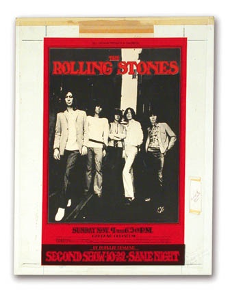 Truly one of the marquee pieces of Bill Graham's Fillmore series is the poster known as BG #201, advertising the Rolling Stones concert appearance at Oakland Stadium in California. Orignal art for Fillmore posters almost never comes on the public market. This is a very rare opportunity to buy on of the most important pieces of original design art from this world famous poster series. Created by artist Randy Tuten, who designed many of the Fillmore posters for Bill Graham, is pen and ink lettering on a retouched photograph with a red rubylith overlay sheet. The artist wrote some technical notes in the margin of the art board. A once in a lifetime opportunity. NM