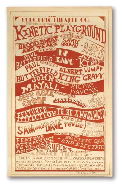 The Kinetic Playgound in Chicago poster for February - March, 1969 announces concerts by Sam & Dave, Blood Sweat & Tears, Jeff Beck, B. B. King and other greats of the time. Signed by the artist, Mark Behrens. EX.
