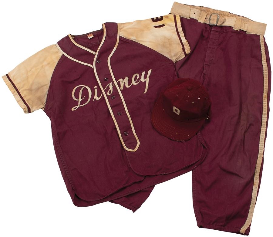 In the analogs of history of the Walt Disney Studios in Burbank, they discuss company baseball games that took place in the period following WWII. This is during the time when the Studio was in a period of unrest because of the cartoonists and general workers' strikes, and this was a way to improve worker's morale by having a company team playing the peaceful and bonding game of baseball. This uniform, is complete, with the familiar Disney script DISNEY that has become synonymous with childhood, whimsy and story-telling. Includes, jersey, pants and cap in maroon and white, number 16 annotated on the shoulder, medium size clothes with a "D" on the front of the cap. Tag reads "Russell Southern Co." and except for two tiny holes on the cap, the overall condition is EX. This is the only Disney Studios uniform we have ever seen and what's most interesting is that it was discovered in Japan!