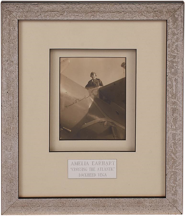 This spectacular quality silver gelatin print shows Amelia Earhart aboard the Lockheed Vega 5B. The distinctive autograph is an 8/10 with no personalization, which is quite rare. On May 20-21, 1932, flying in this airplane, Earhart became the first woman (and the only person since Charles Lindbergh) to fly nonstop and alone across the Atlantic Ocean. She took off from Harbor Grace, Newfoundland, Canada and landed 15 hours and 2,026 miles later in a field near Londonderry, Northern Ireland. The feat made Earhart an instant worldwide sensation and proved she was a courageous and able pilot. Immortalized in this image with a silver plate, "Amelia Earhart Crossing the Atlantic Lockheed Vega." Condition is NRMT, overall measures 9.25x11".