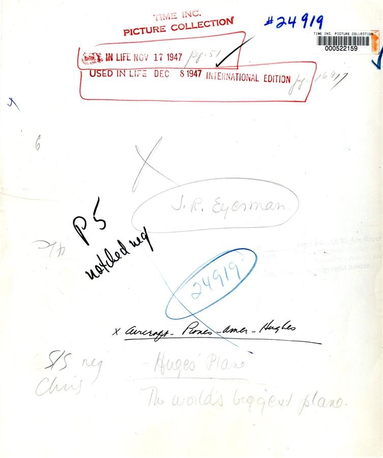 This amazing Type I 8x10" image spanned the pages of "Life Magazine" on December 8th, 1947. It has Life usage on verso, including Time Inc and 1947 date stamp, and pictures one of the most popular and beloved planes in aviation history; the Hughes H-4 Hercules (also known as the "Spruce Goose") was a prototype heavy strategic airlift military transport aircraft designed and built by Howard Hughes. The Hercules is the largest flying boat ever built and has the largest wingspan of any aircraft in history. Condition is EX.