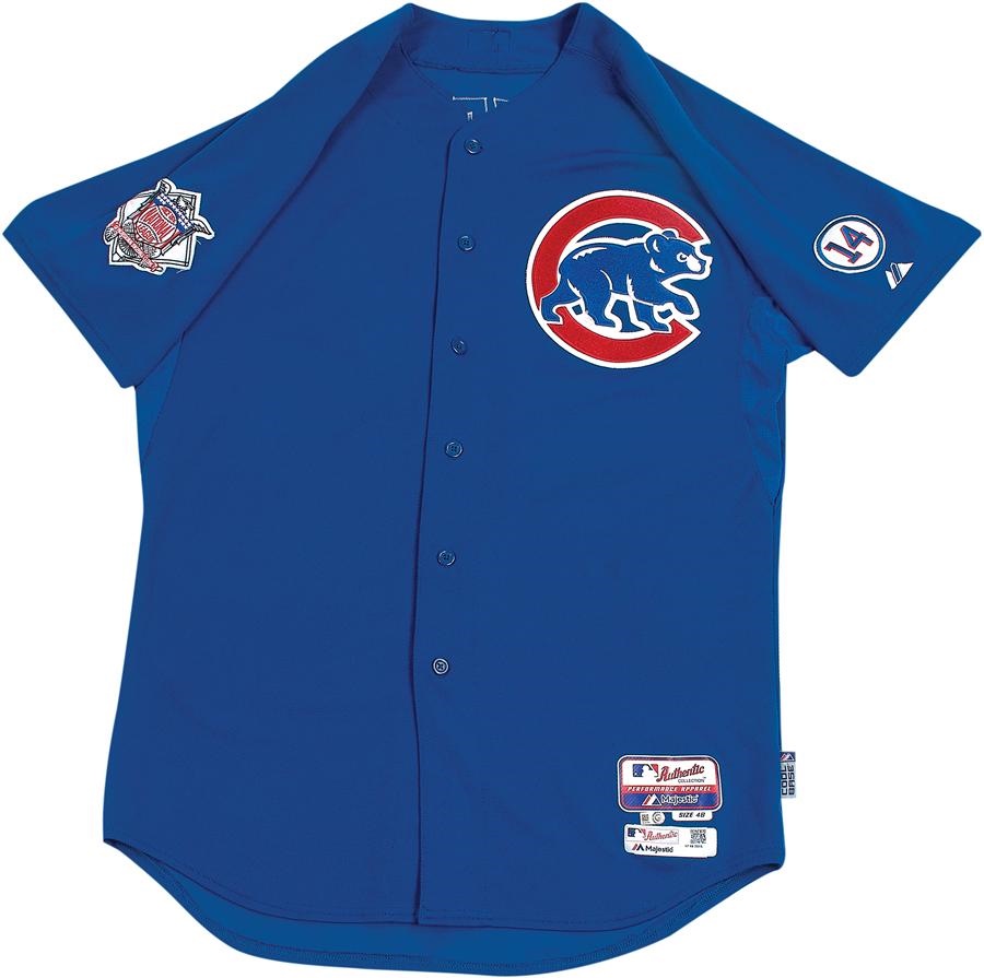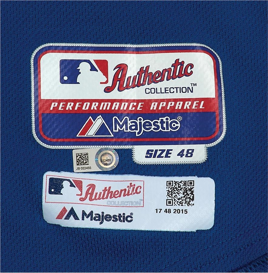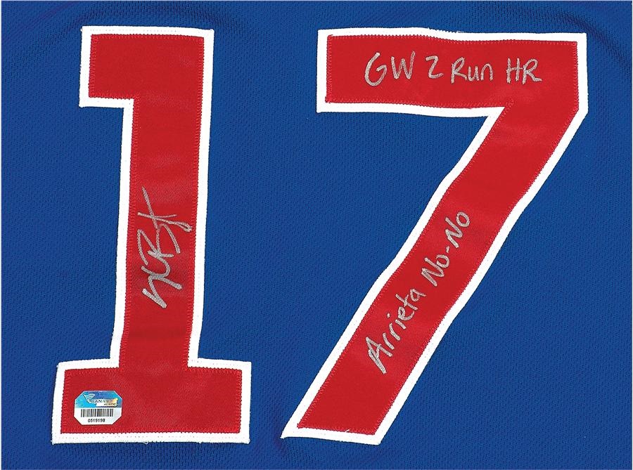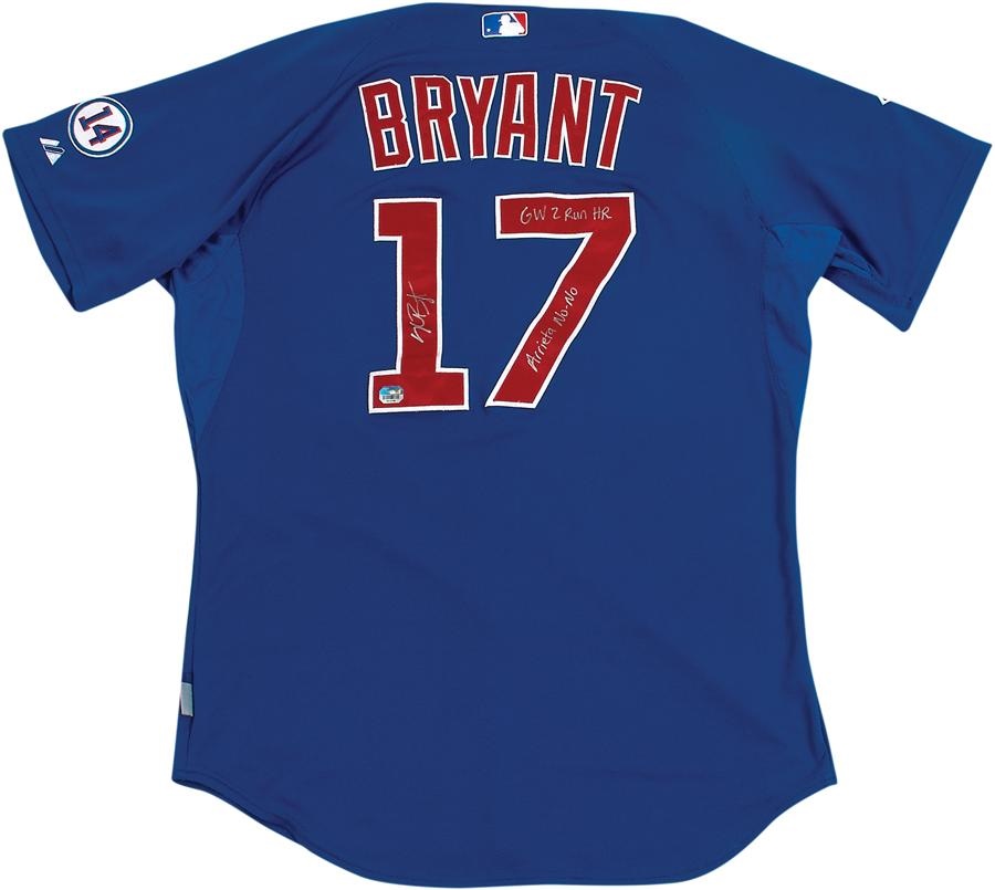 Kris Bryant provided the only swing Jake Arrieta would need on that fateful Sunday night. In front of a national TV audience, the Cubs right-hander and eventual 2015 Cy Young Award winner tossed a no-hitter at Dodger Stadium, with the only offense provided by eventual National League Rookie of the Year Kris Bryant, who blasted a two-run homer in the first inning. This blue #17 road jersey was worn by Bryant in that historic August 30 game. It is signed on the back with "GW 2 Run HR, Arrieta No-No" inscriptions. There's also a hologram from Fanatics for autograph and inscriptions, MLB hologram "JB022455" and two patches of interest: one commemorating Mr. Cub, Ernie Banks, on the left sleeve, and one representing the National League on the right.