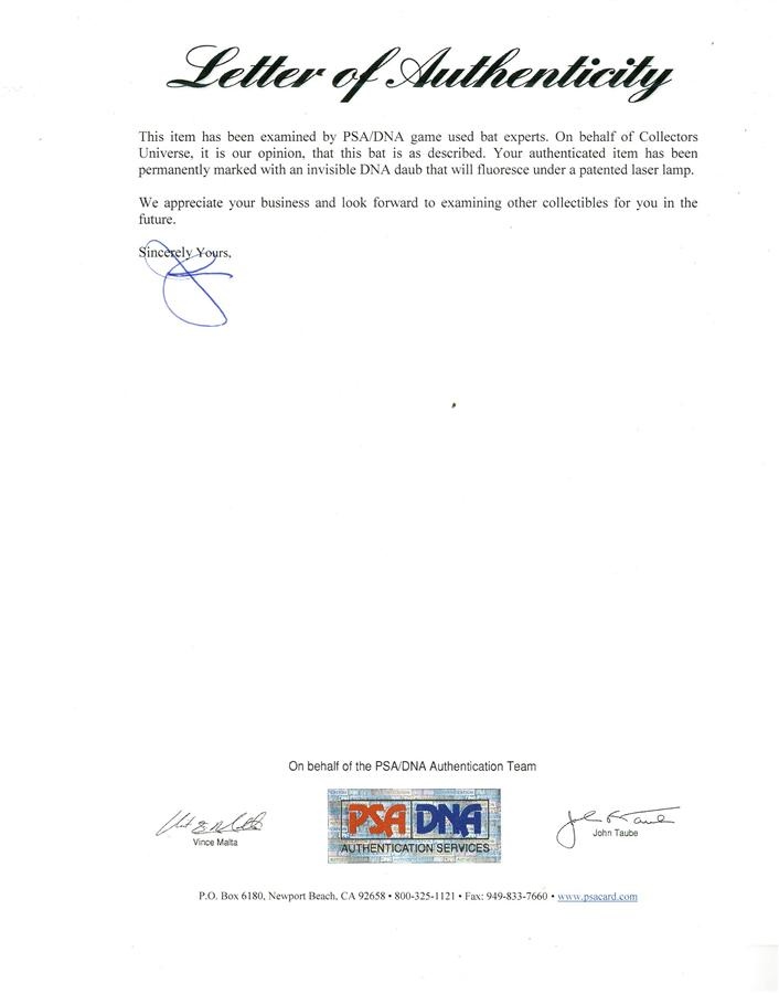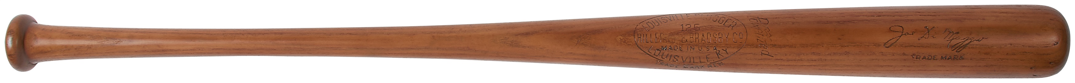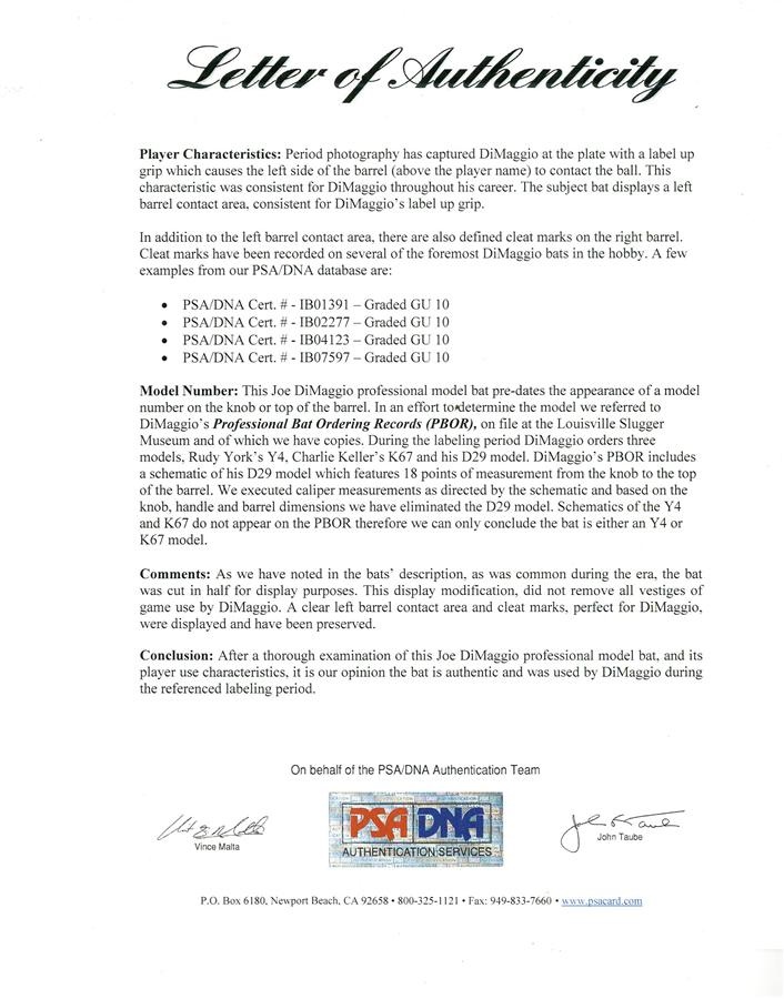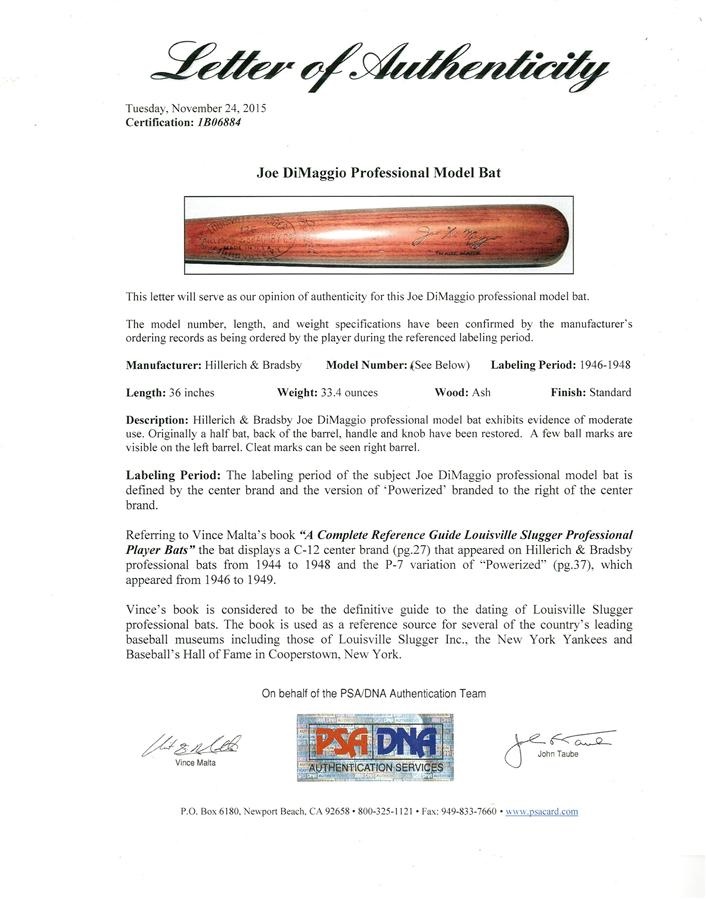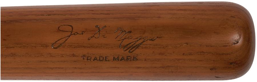 From a powerful period in the great career of Joseph Paul DiMaggio. Labeling dates it from the 1946-48 era, which included a third MVP and another World Championship (1947) and another great year in 1948 with an impressive .315 batting average while gracefully patrolling center field the entire era. Magnificent uncracked bat is a thing of beauty. The Hillerich & Bradsby specimen does not have a model number on the barrel. Measuring 36" and weighing 33.4 ounces makes it custom perfect for the Yankee Clipper. The bat shows exceptional use with both multiple ball and spike marks on the barrel. The back of the barrel has been restored by a highly skilled professional and the restoration is not noticeable to the naked eye. Comes with an LOA from highly respected bat expert John Taube of PSA. IMPORTANT NOTE: This bat came directly from the collection of fellow Yankee George "Snuffy" Stirnweiss. It was on display in his New Jersey home along with the bat of Lawrence Peter "Yogi" Berra, also in this auction.
