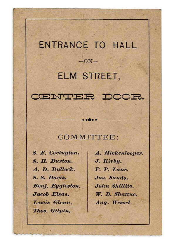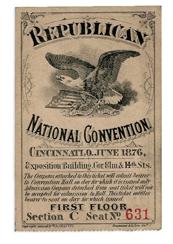 Here is a rare ticket to the centennial 1876 Republican National Convention held at the Exposition Hall in Cincinnati, Ohio, on June 14-16, 1876. President Ulysses S. Grant failed to seek a third term because of a failing presidency, weak economy and Democratic gains in Congress. Instead the convention resulted in the nomination of Governor Rutherford B. Hayes of Ohio for President, and Representative William A. Wheeler of New York for Vice President. The process was entertainment and theater for the political sect, often contentious as various factions of party insiders maneuvered to advance their candidates. Ticket measures 1.75x4" and is for a really good seat, first floor, section C and EX+ condition.