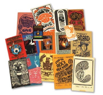 An amazing selection of four hundred and eighty seven pieces, the majority of images represented here includes mailers, handbills, rare color variations, some with schedules and some doubles. One letter on verso even talks about seing the Doors; another, from 6/24/67, claims "at Monterey Jimi performed magnificantly, just like his records he even ended up burning his guitar ..imagine that." This is an unparralled investment in the psychedlic art of music. Included are work by all the greats: Rick Griffin, Mouse & Kelley, Victor Moscoso, Wes Wilson, Lee Conklin, David Singer, Randy Tutten, and even Bonnie McCain (Bill Graham's wife). A truly unbelievale collection. Rarities such as B19, the Beard, Batman handbill, BG2, BG-0 handbill, BG3 & 4, BG-7 super rare versions, Airplane, Dead, Lenny Bruce, Andy Warhol, Quicksilver, Doors, CSNY, Who, Byrds, Zep, BB King and many more. All are VG-NRMT condition, some have pin holes. They are bound in acid free art portfolios in chronological numbered order. A very intense collection.