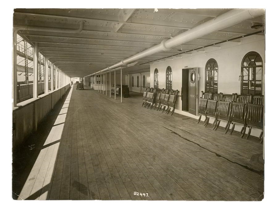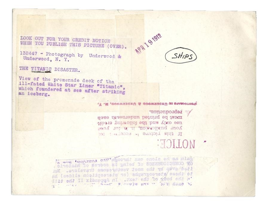 The most sought after of all Titanic photos are those that are of the interior of the ship, and of course, are date stamped before or directly following the sinking of the gigantic ship. This photo is date stamped four days after the ill-fated liner went down, and is of the promenade deck by photography studio Underwood and Underwood. The only flaws are two 1/4" corner creases. Photo measures 6.5x8.5".