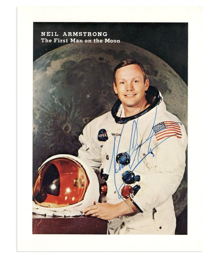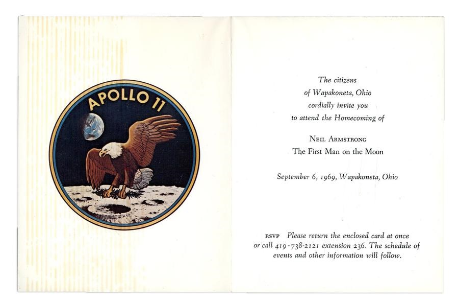 This is a secretarial signed invitation to the homecoming of Neil Armstrong, from the citizens of Wapakoneta, Ohio, after he became "The First Man on the Moon." This is probably unbelievably rare because if you wanted to attend you were to return the enclosed card or call the number referenced. On the front is a secretarial signature and the familiar portrait of Armstrong, most known for the moon landing. On the verso, is a large full color logo of the Apollo 11. The folded program - it was intended to be folded - is NRMT except for the lines on the back from long-term placement in a 1970s scrapbook. Measures 5.5x8.75".