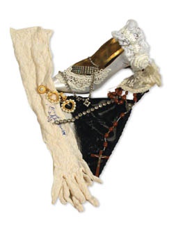 A true potpourri of Madonna personal articles from her dressing table. A white satin pump signed on the side, a pair of lace gloves, signed, a signed black lace panty and an assortment of rosary beads, a rhinestone necklace, braclet drop earrings, all from the Material Girl era.
