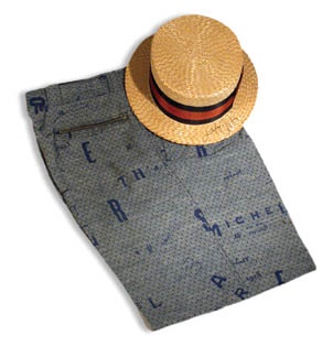 Elton was ever one to be challenged in the flamboyant department; nonetheless, the two items on offer here are part of a decidedly less flashy ensemble sported by Sir Elton for his "Sad Songs" tour. A pair of gray slacks with bizarre pattern and a signed straw hat were key elements in this subtly attired version of the pianist/singer/composer.