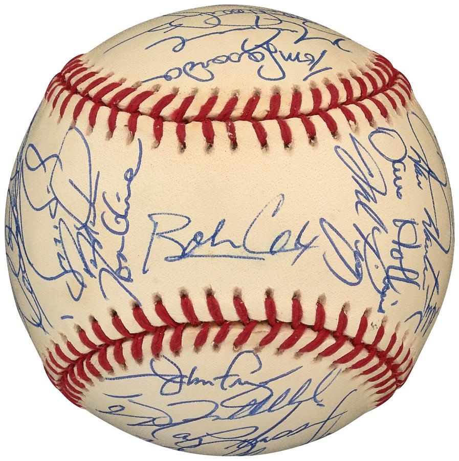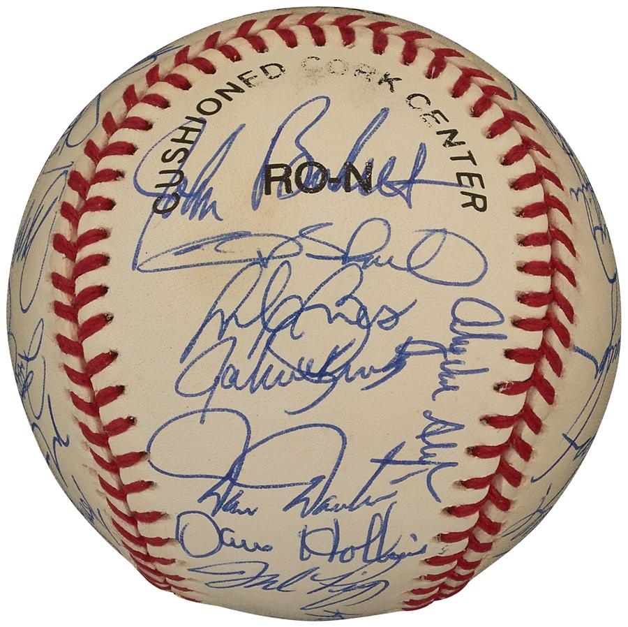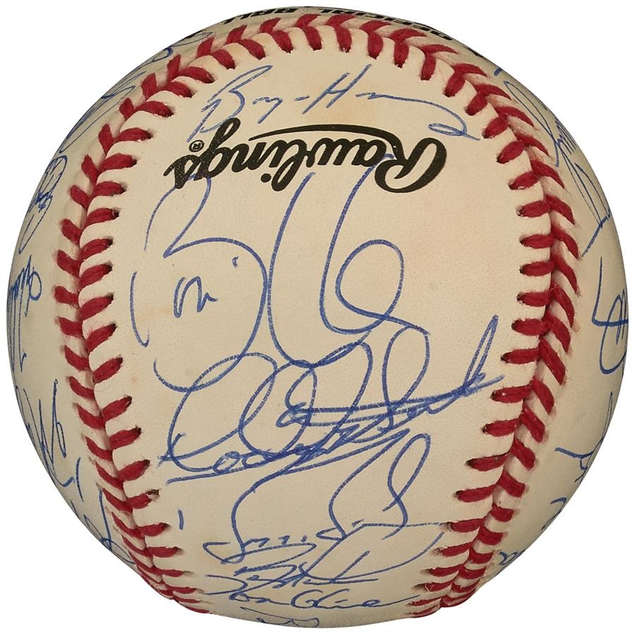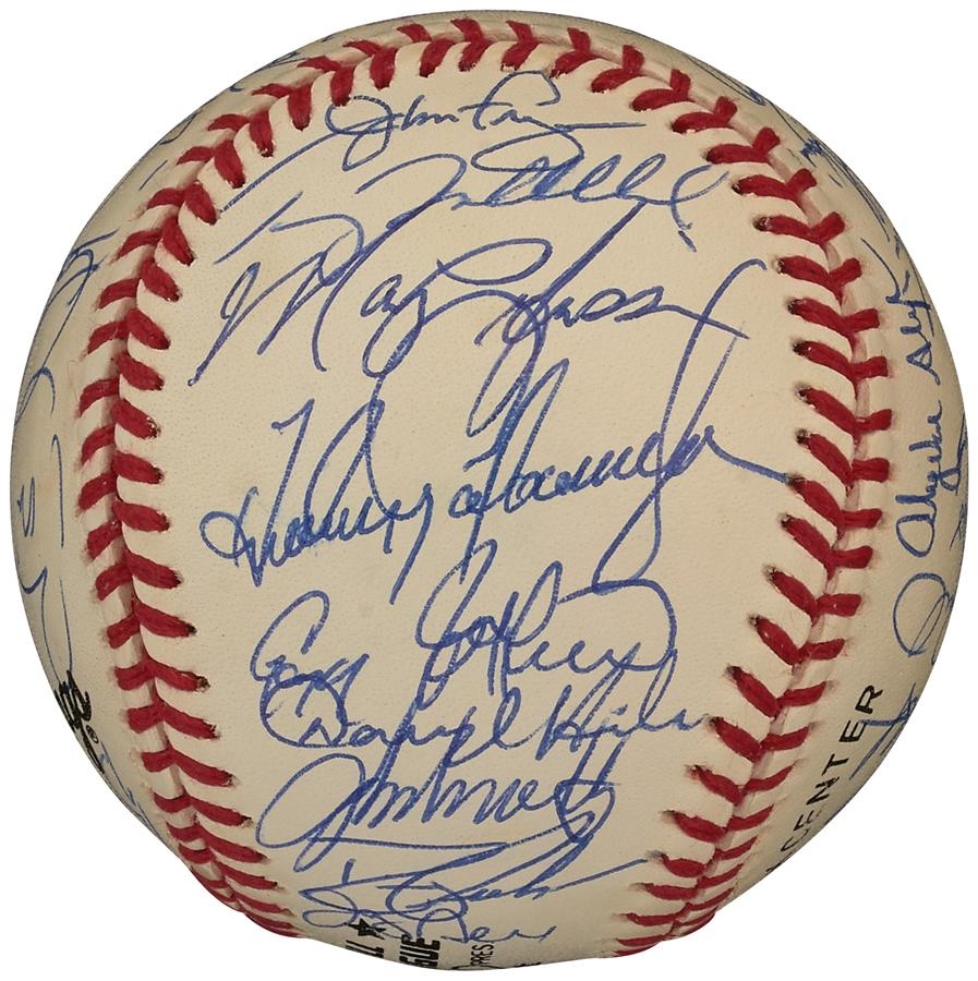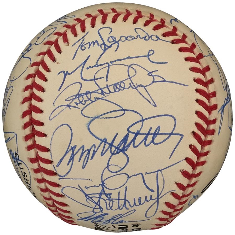The National League lost the 1993 All-Star Game in Baltimore by a 9-3 count, but 31 members of their team signed this very high grade, official National League (White) baseball in blue ballpoint pen. The ball is in NRMT-MT condition while the signatures rate 8-9/10. Included on the ball are: Lasorda, Cox, Bonds, Sandberg, Gwynn, Piazza, Larkin, Glavine and many more.