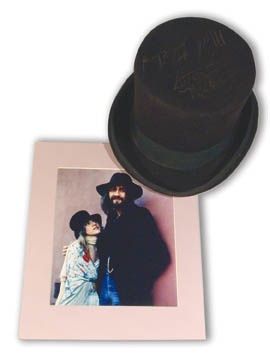 As seen in the photograph, this jet black felt chapeau graced the crown of Ms. Nicks, always a fashion trendsetter, as she posed coyly with veteran drummer and group namesake Mick Fleetwood during the Fleetwood Mac 1978 tour promoting their "Tusk "album. Signed on top by both members of this well respected British quintet and made by the Eddy Hot Co.