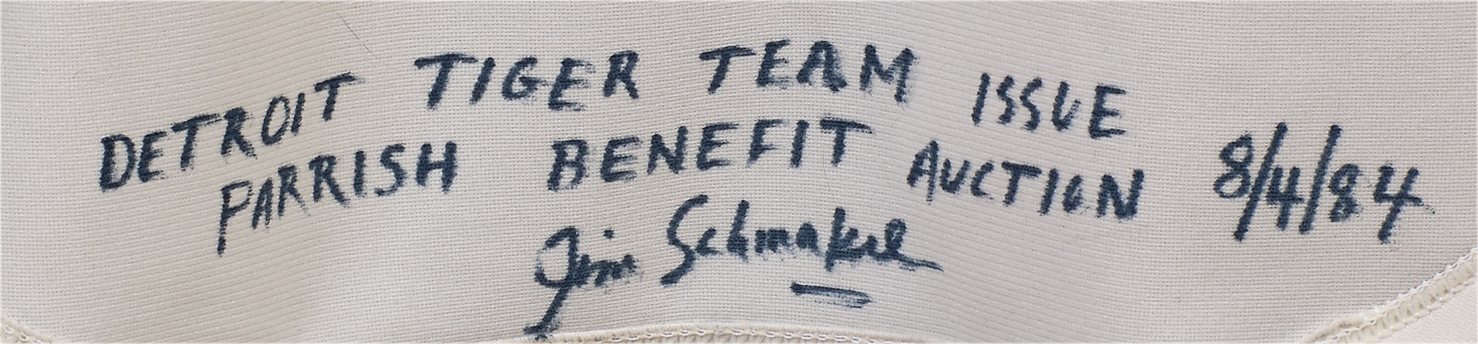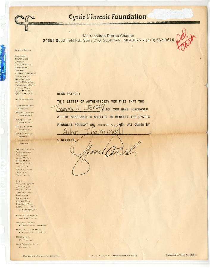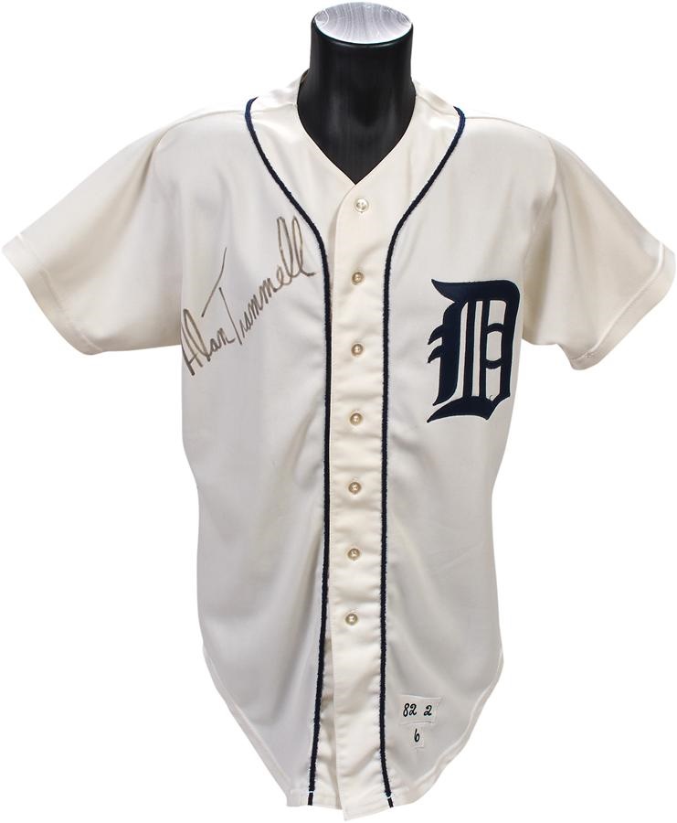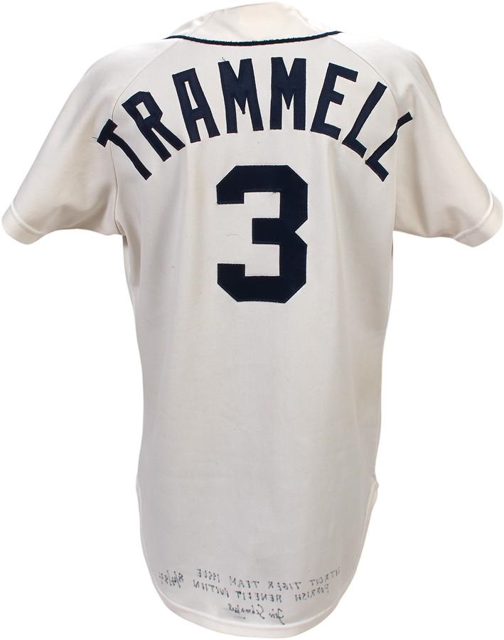 Alan Trammell spent all of his 20-year MLB career in the Motor City, and this Detroit Tigers home jersey was worn by the star shortstop in 1982. It shows nice use and is all original, featuring the Tigers' Gothic "D" on the left breast and "TRAMMELL" sewn directly on to the back with "3" below. There's a Wilson size 42 tag in collar and "82 2" and "6" tagging on the front tail; the "82" is the year and "2" is the set. The "6" would typically represent the jersey number but in this case we are not sure - the jersey is 100% original and does not have a number changed. It's signed on the front by Trammell in 7/10 black marker and comes with a copy of LOA from the Cystic Fibrosis Foundation that states that this jersey was part of a charity auction in 1984; that letter is signed by Lance Parrish.
