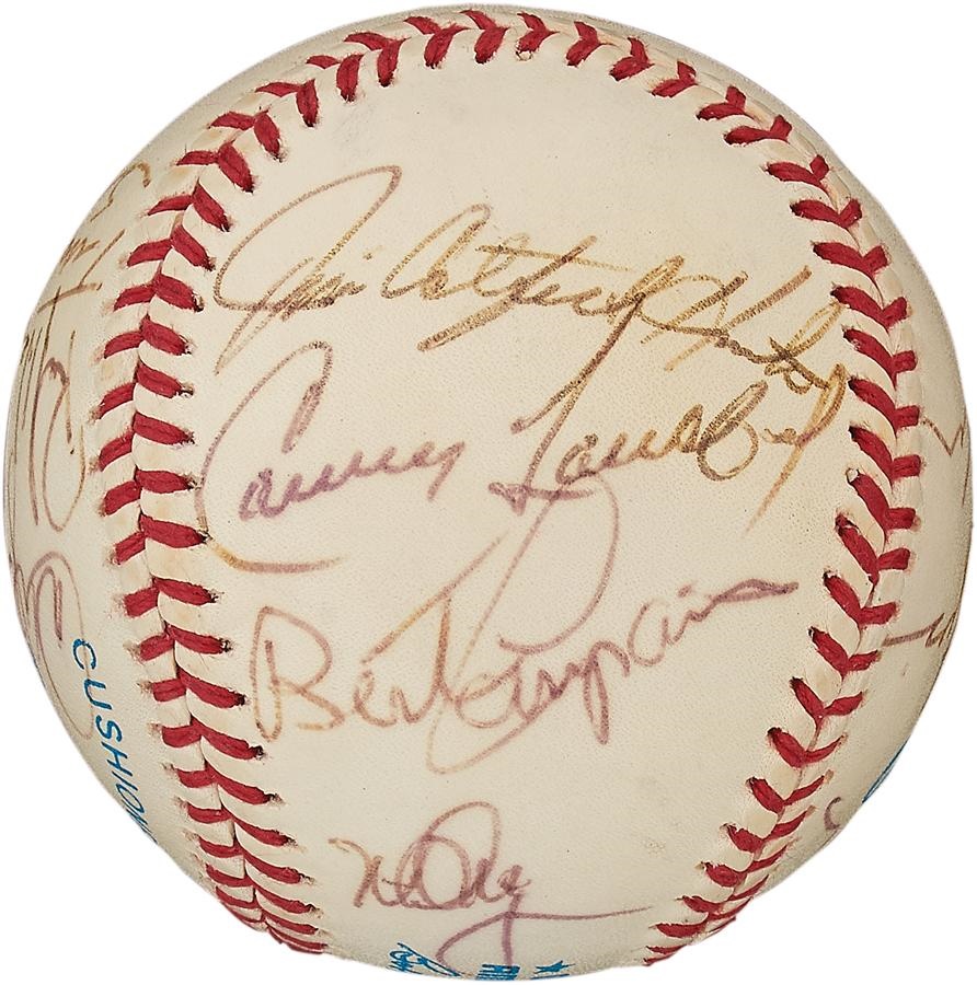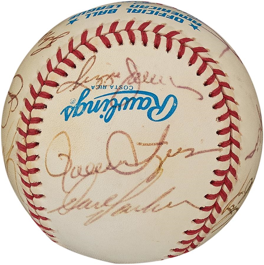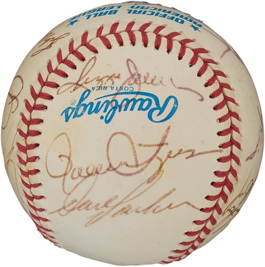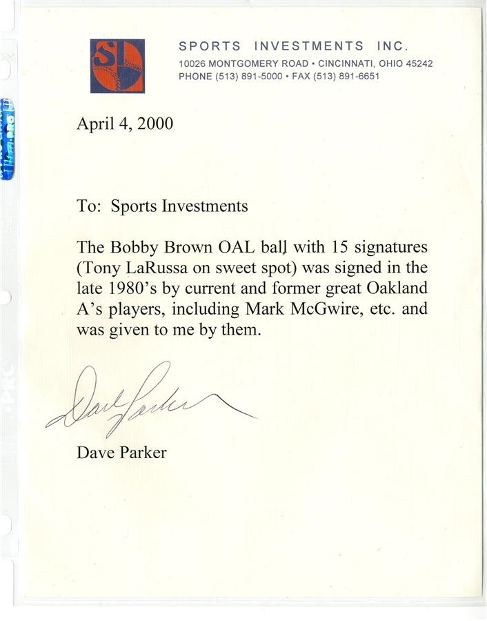 The creme de la creme of Oakland A's baseball history are regaled on this special baseball that comes from the collection of Dave Parker and also has a signed LOA from him. The official American League (Brown) baseball is NRMT and features 15 signatures that average 7/10. They include: Fingers, R. Jackson, Canseco, Hunter, McGwire, Blue, Eckersley, Parker, R. Henderson, LaRussa and more.