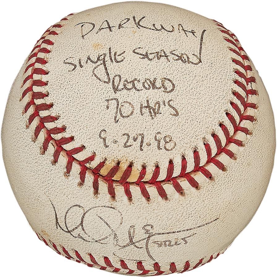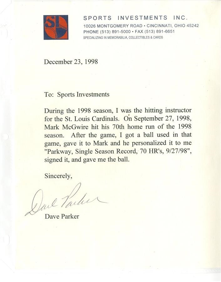 Baseball's first 70-home run man - Mark McGwire - made history on September 27, 1998, when he blasted his 69th and 70th homers of the season against the Montreal Expos in St. Louis. This baseball, which was used in that game, was given to Dave Parker by McGwire after the final out and it comes with an LOA from Parker. The ball is signed on the sweet spot in 7/10 ink by McGwire, who also inscribed: "Parkway, Single Season Record 70 HR's, 9/27/98." The official National League (Coleman) baseball shows light use.