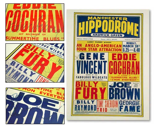 Eddie Cochran was on the threshold of becoming a superstar as the 1960s began. He already was as influential in Europe as Elvis had been at a similar stage in his career. He was booked for a major European tour with Gene Vincent and Billy Fury. Before embarking on the European tour Eddie wanted to first play before his main fan base in England. The tour got a tumultuous welcome by fans, including future Beatle George Harrison who attended almost every performance. On April 17, Eddie, girlfriend Sharon Sheeley and Gene Vincent headed for the airport in a chauffeured limousine. On the way a tire blew out and the driver lost control. The car rammed into a lamp post and Eddie died within a few hours from multiple head injuries. Shortly after his death, Eddie's last hit, "Lonely," topped the charts. This poster for the March 28th show at the Hippodrome in Manchester, only 20 days before his death, is beautifully signed by all the name performers and is matted and framed. An astounding piece of early rock n roll history. Poster and signatures NM.