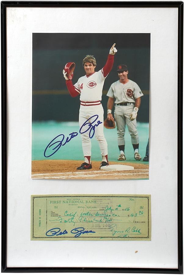 When Pete Rose, broke Ty Cobb's major league record in 1985, he connected the two of them forever in the annals of baseball history. This framed display features an original Ty Cobb personal check dated July 10, 1956, and drawn on The First National Bank of Nevada. The check is made payable to "Calif. Water Services Co." and is signed by "Tyrus R. Cobb" in green fountain pen. What makes this check unusual is that it is also signed by Pete Rose, circa 1985 after he beat Ty's record, in blue Sharpie rating a 9/10. The check measures 3x8" and has normal bank cancellation holes and stamps, Ty's signature is an 8/10 overall condition VG. To complete the display is a photo of Pete beating the record in 1985, with a large, bold brilliant 10/10 autograph also in pristine blue sharpie. Comes with an LOA.