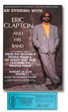 Stevie Ray Vaughan died on August 27, 1990 in a helicopter crash after leaving a concert at Alpine Valley, Wisconsin where he was performin' with his brother Jimmie, Buddy Guy, Eric Clapton and Robert Cray. This original first printing poster advertising that concert at Alpine Valley Music Theatre comes along with an promotional ticket voucher giving free admittance to what would be Stevie's final performance. Both NM.