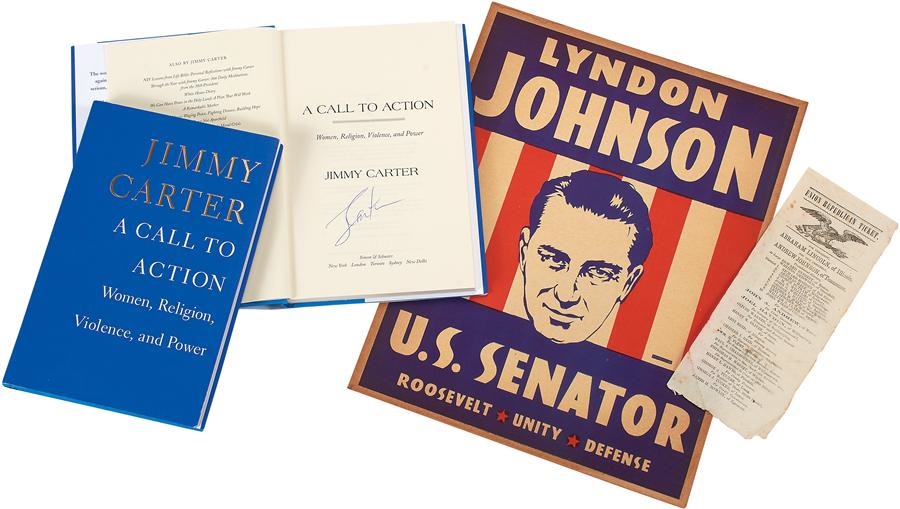 Here's a collection of four presidential items at the root of our history, past and present. An original 1860s Union Republican Ticket provides as a great perspective as Abraham Lincoln appears atop the 8.5x3.5" ballot that also includes Andrew Johnson as vice president, John A. Andrew for Massachusetts governor, Joel Hayden for lieutenant governor, Oliver Warner for secretary of the commonwealth and many others. VG+ condition. Also, a silkscreen poster for the 1948 senatorial election that Lyndon Johnson stole and won by a mere 48 votes. Heavy cardboard, measures 11x14", and is EX-MT. The last two items are first edition NRMT with dust jacket signed by Jimmy Carter, one signature is EX and the other is EX-MT.