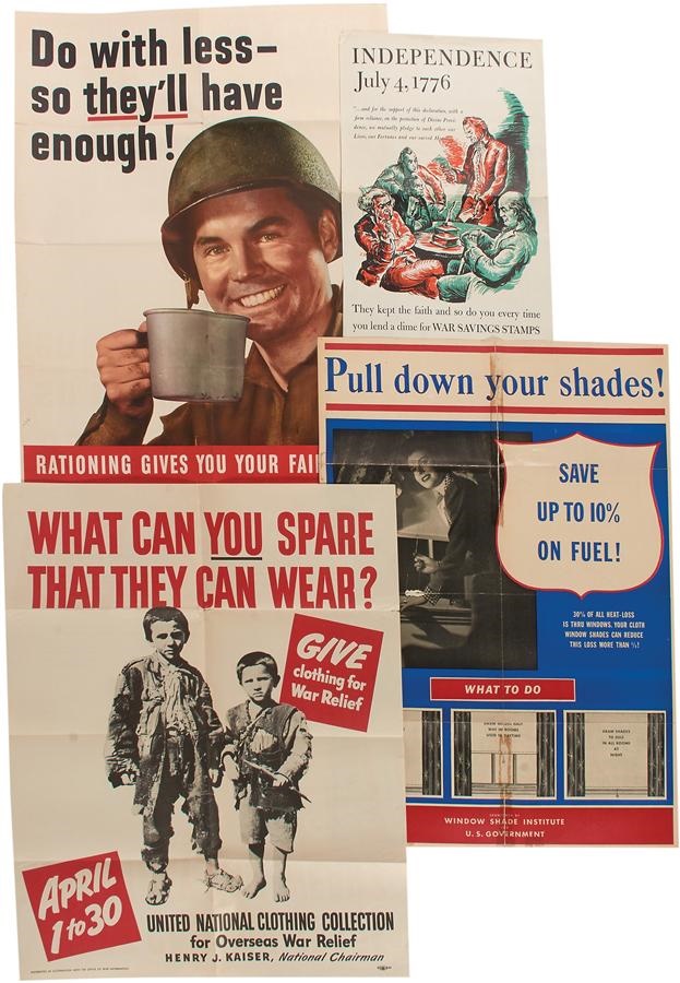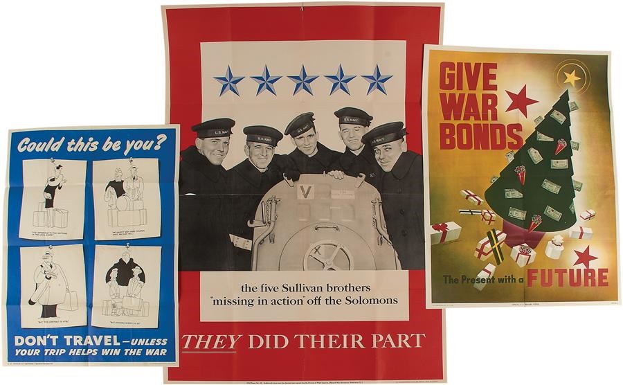 Here's a hearty lot of nine WWII propaganda and other posters, most issued by the U.S. government to get the citizens to invest their lives, heart, souls and money in the war effort. Also a program with FDR on the cover, from the 1937 All Star Game. The WWII posters include the following: The Sullivan Brothers KIA "They Did Their Part" Five brothers pictured in Navy Uniforms 1943 (folded EX-MT one 2" tear 28.5x40"), "Do With Less So They Have More" rationing poster full color image of soldier drinking coffee (folded EX-MT OWI#27 1943 22x28"), "Don't Travel Unless Your Trip Helps Win the War" golfing image (folded EX-MT 1945 18x26"), "Give War Bonds, the Presents With A Future" full color Christmas tree with presents (folded EX few small tears 1943 20.5x28"), united national clothing collection for overseas war relief (folded EX-MT 1941 22x28"), Savings Stamps 1776 Independence (folded 12x18" VG), pull down your shades, great graphics but condition issues (folded Good 20x28"), and more. Also includes Pretty Boy Floyd Jr. becomes a benefactor to society advertisement, opens to a large poster of "think right live right" with children's graphics of the United States, also has condition issues. The All-Star Game Program with FDR on the cover for July 7, 1937, at Griffin Stadium, American League vs. National League in VG condition.