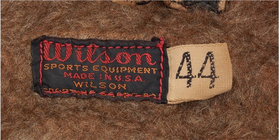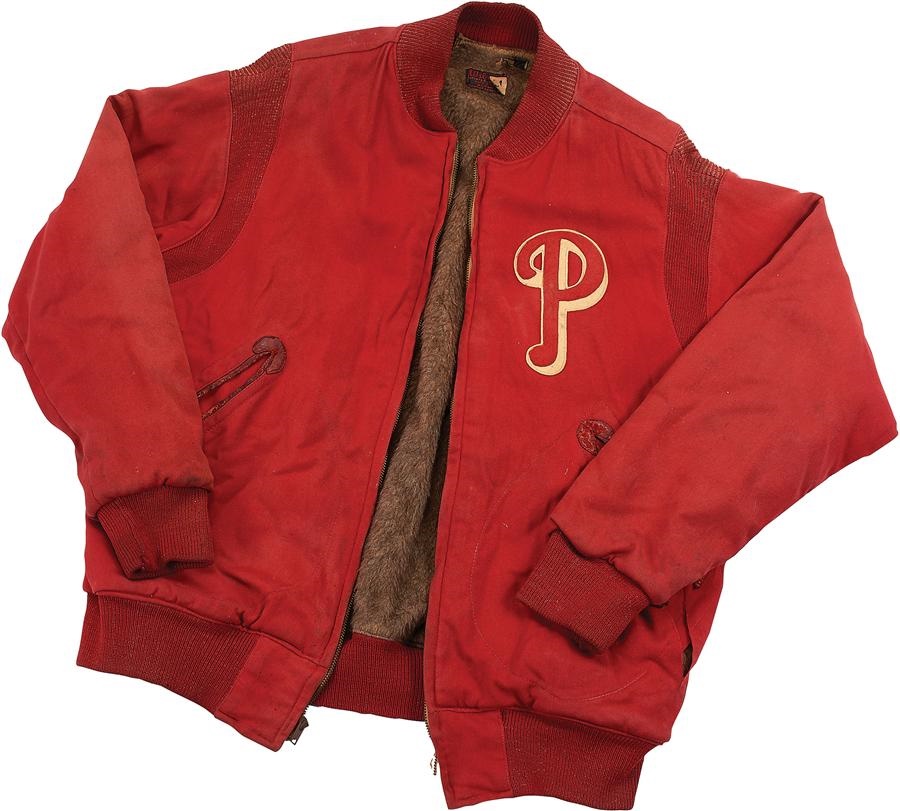 This classic game worn Philadelphia Phillies jacket surely came in handy during those chilly early and late-season games in the northeast. Circa 1950, it has a high-quality wool lining, a Wilson tag with size "44" and shows extensive use, with a rip in the left pocket. Phillies who donned #16 during this time frame include Johnny Blatnick (1950), Lou Possehl (1951), Mel Clark (1952-55), Frank Baumholtz (1956-57), and Chico Fernandez (1957-59).