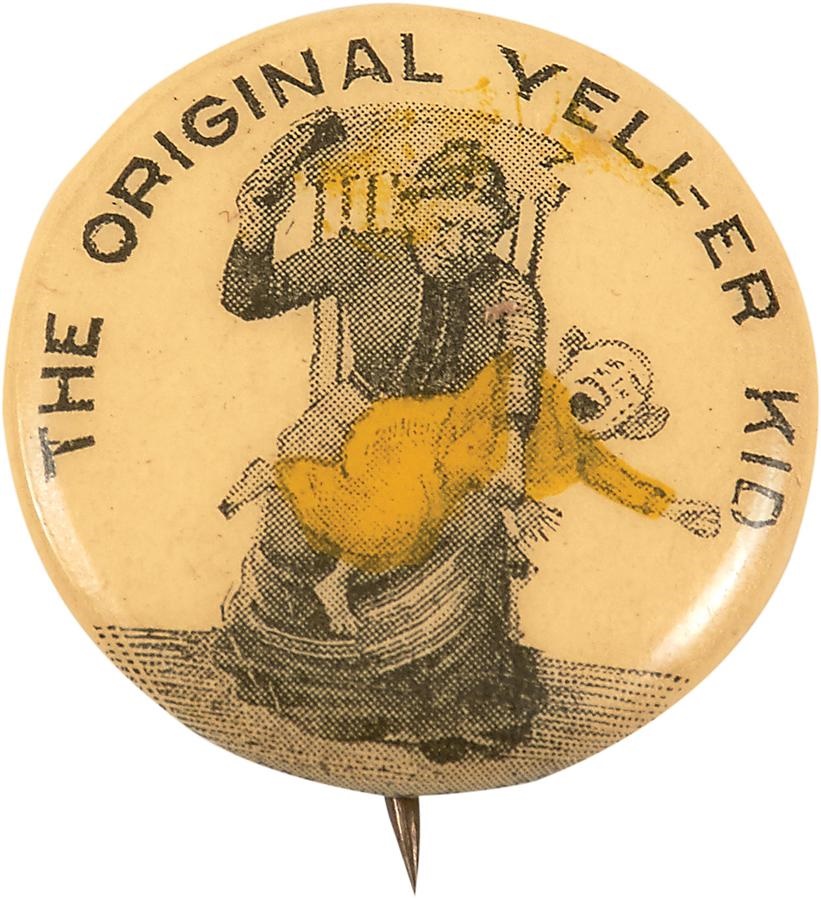 This rare 0.88" pin depicts a woman in rocking chair holding a shoe, ready to spank The Yellow Kid, whose nightshirt is accented in bright yellow. This is the first one we have ever seen, one of the rarest comic character pins ever discovered. In NRMT condition.