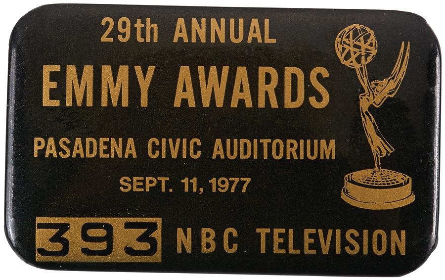 An interesting and unique pinback button, this is entitled, "29th Annual Emmy Awards, Pasadena Civic Auditorium Sept. 11, 1977 NBC Television." The number on the pin is 393, and the black background with gold lettering is great-looking. When you see this piece in person you want to keep it. Top winners of the night were: The Mary Tyler Moore Show, and Roots. Measures 2.75x1.63" and is in NRMT condition.
