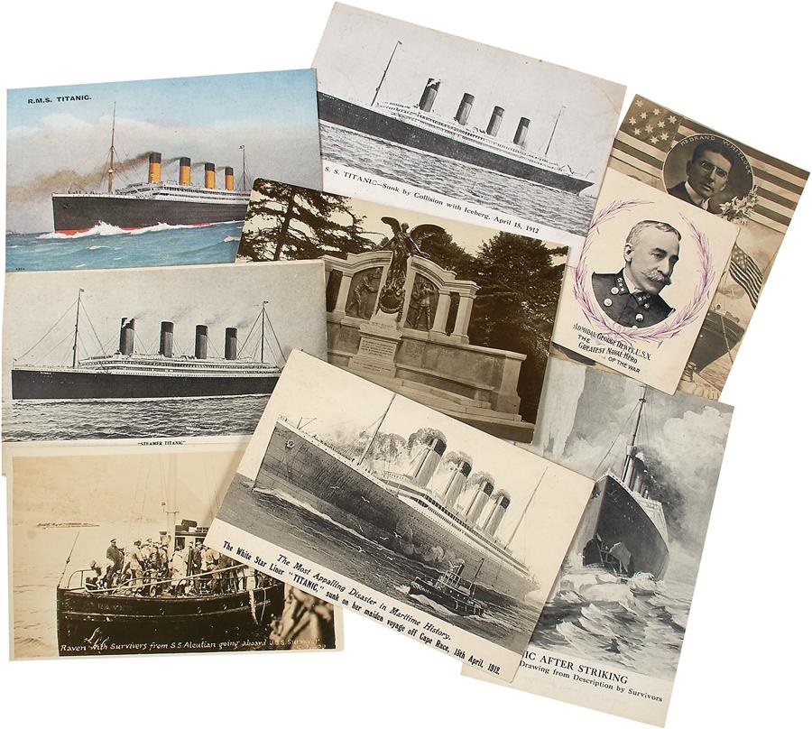 In this lot is a collection of nine maritime postcards, including six Titanic postcards, issued in 1912, right after the disaster occurred. The best of these reads, "The most appalling disaster in maritime history," and has all the details of the composition of the ship, such as length, breadth over all, number of watertight bulkheads and other features of the ship. Includes the Titanic after striking, S.S. Titanic sunk by collision with iceberg and Steamer Titanic. Also a real photo Titanic Memorial from circa 1912 and it is VG-EX. The last is full color and reads "RMS Titanic" and is also EX to EX+. There is a real photo postcard of survivors of the sinking of the S.S. Aleutian in EX-MT condition, L'Amerique with the minister of Belbique and a private mailing card in NRMT condition of Admiral Dewey circa 1898; this is the earliest era of postcards in the United States.