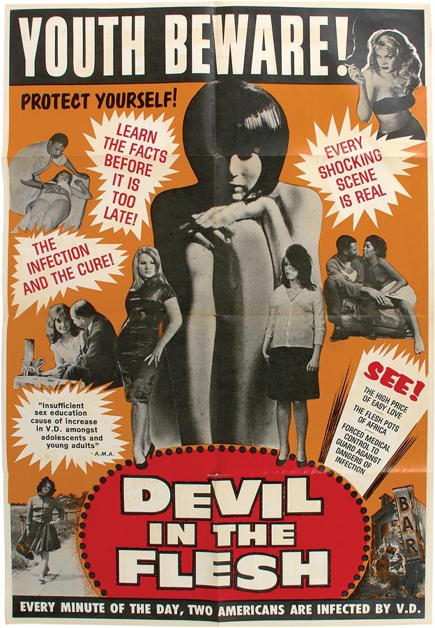 From the "Sexploitation" genre, this one-sheet poster measures 28x42" and has great sexploitation graphics perfect for the period and subject. Entitled "Devil in the Flesh" and "Youth Beware," titillating subject matter, typically hidden in an anti-message. Has a tear on the fold overall EX-MT condition.