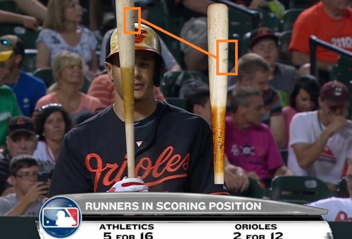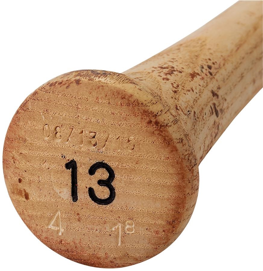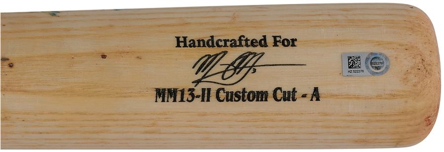 Among the highlights of his all-star 2015 season, Manny Machado used this Marucci MM13-II Custom model bat to hit a walk off HR against the Oakland Athletics in the 13th inning on August 14. Includes the MLB hologram with serial number "HZ522278" and is engraved "8/13/15" and "13" on the knob. This photo-matched bat measures 34" long and weighs 32 ounces, has extensive pine tar residue and is cracked on handle. The home run was one of the third baseman's 35 for the season.
