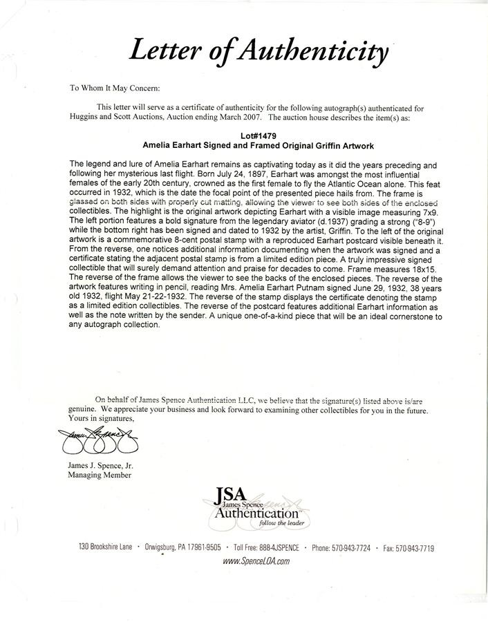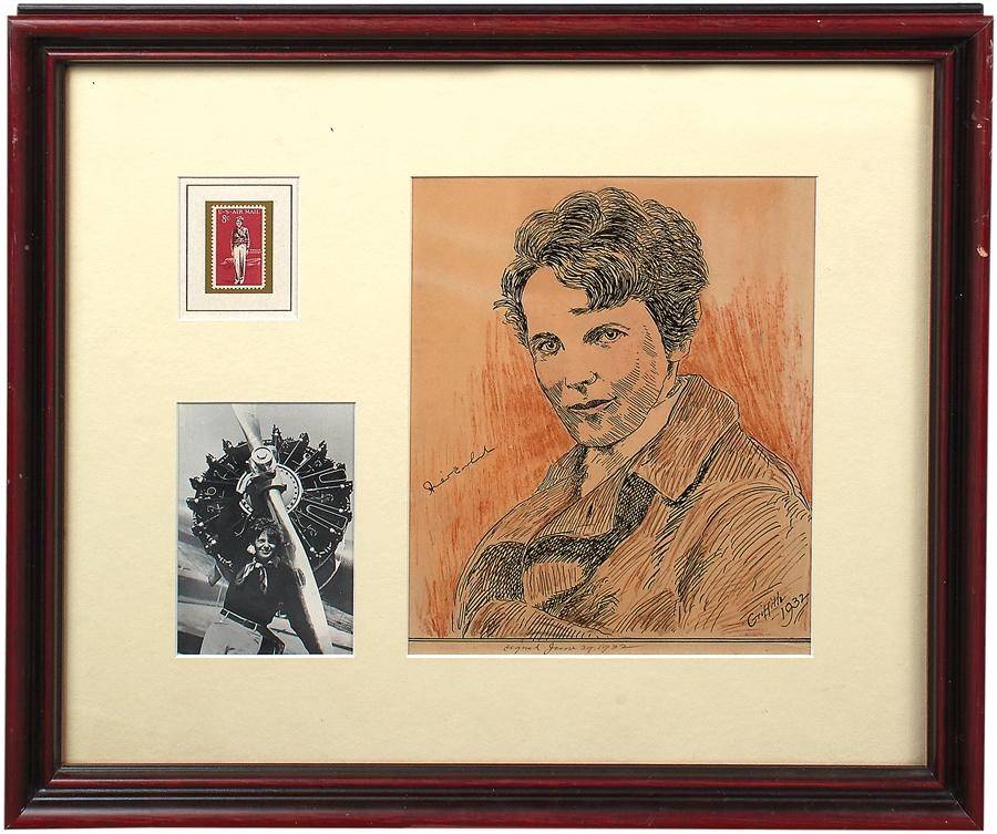 Her disappearance remains one of America's great mysteries. This beautiful shadowbox includes a signed 7x9" original artwork of famed aviator Amelia Earhart. The drawing is signed "Griffith 1932" by the artist on on left hand side and is a strong autograph. Written is "Signed June 29, 1932" which is a month after her historic transatlantic solo flight. Also included is a limited edition stamp and postcard. All is enclosed in a classic 18x15" cherry wood frame, which does display some minor chips. Earhart vanished in 1937 while attempting to circle the globe, and her fate is a curiosity to this day. Comes with JSA LOA.