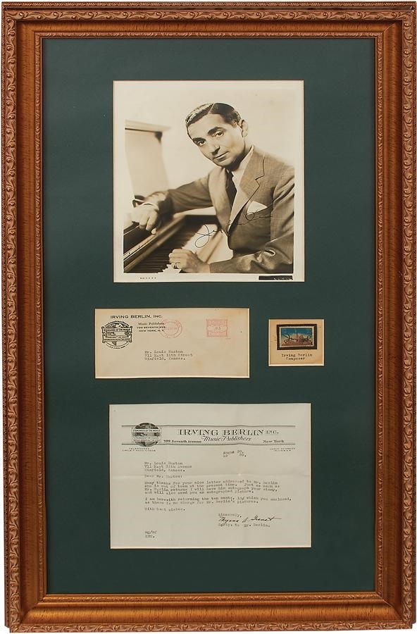 This display is an elegant, ornate gold gilted frame against a handsome dark green matte which has a letter on Irving Berlin Music Publisher's stationery; addressed to autograph collector Mr. Louis Huston from Irving Berlin's secretary also, is the envelope, autographed stamp, and a signed 8x10" photo. He says he is returning his dime as there is no charge for Mr. Berlin's pictures and that he will sign both the picture and the stamp. This is the gist of the letter. Signatures are an 8/10 and are in fountain pen. Irving Berlin was a famous Jewish American songwriter one of the greatest in history, and he is best known for "God Bless America." Berlin's daughter stated that the song was very personal and was intended as an expression of his deep gratitude to the nation for allowing an immigrant raised in poverty to become a successful songwriter. Measures 30.5x16.5x1.5" and EX+ condition.
