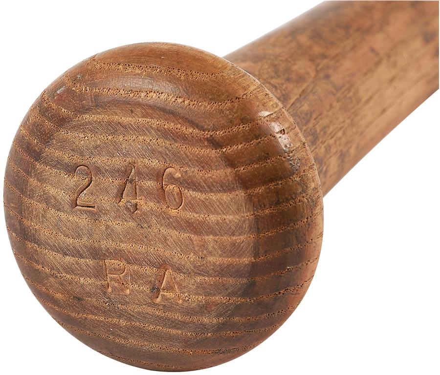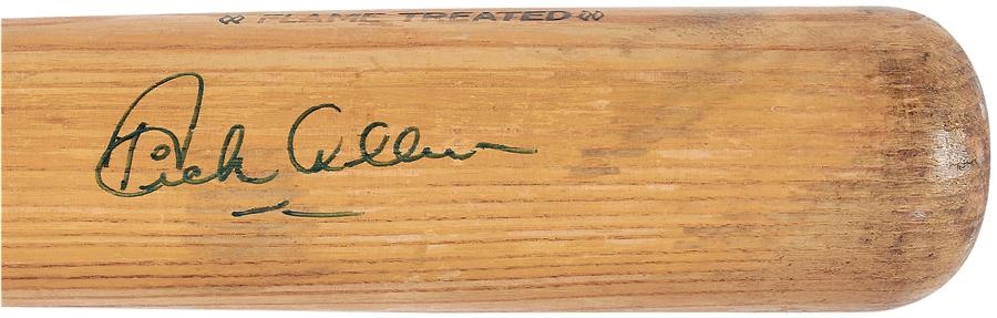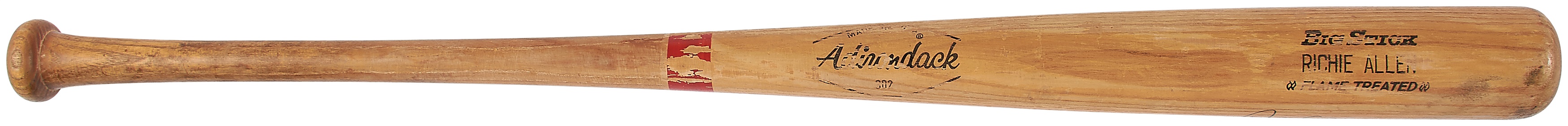 Appropriately part of Adirondack's "Big Stick" line of bats, this hefty model was used by slugger Dick Allen during his stint in the 1970s. Weighing in at a bulky 40.4 oz. and measuring 36", it has the name "Richie Allen" engraved on the barrel and it is signed in blue marker directly below the nameplate. Engraved on the knob is "246 RA," the bat is uncracked and shows nice game use.