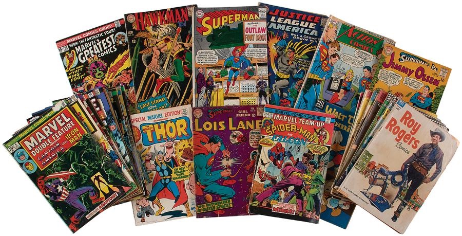 1) MARVEL (37): 12 cent (8) mostly Thor, 15 cent (2) FF & Sub-Mariner, 20 cent (12) Thor, Marvel Tales, etc., 1960s 25 cent (4), and 1970s later (11). 2) DC (21 all 1960s): Superman, Teen Titans, Adventure and more. 3) MISC (20): Mostly old Dells, Gold Key (Man from UNCLE) and Disney. Overall GD-VG, a total of about 78 books.