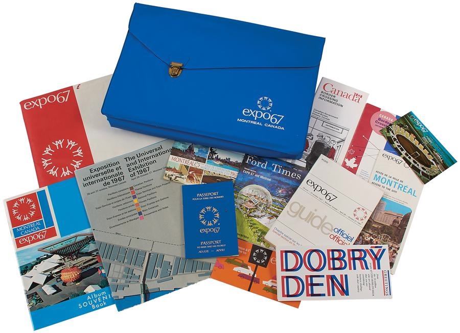 This good looking blue vinyl carrying case measures 11.5x15" and contains all kinds of promotional pamphlets and paperwork from the various exhibits at the Montreal Expo '67. The case reads "By Alana Plastics 1963 Expo 67." Also includes press information and clippings, an example of a full passport including a "First Class Shooter" from the Buffalo Bill Gallery, and 30+ pamphlets and postcards; many, many extras that were given only to the press as publicity for the Fair. From a New Jersey sportswriter, the condition averages EX-MT.
