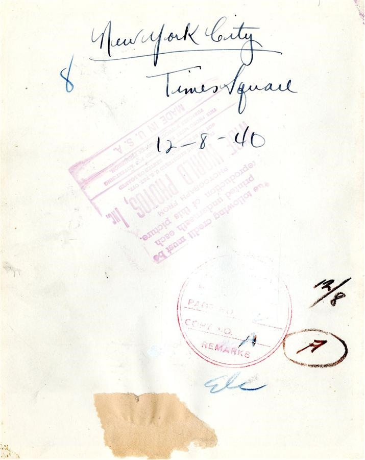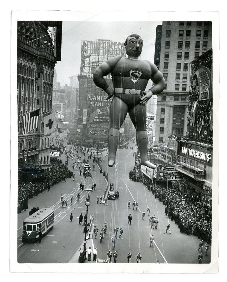 This is so early in the history of Superman as he first appeared in Action Comics #1 in June 1938, and the first time such a massive likeness appeared in the Macy's Thanksgiving Parade. The photo shows Superman against the Planter's Peanut and Coca Cola Display in Times Square. If you look down the road, Santa Claus is coming to town. Photo measures 7x9" and is in EX-MT condition.