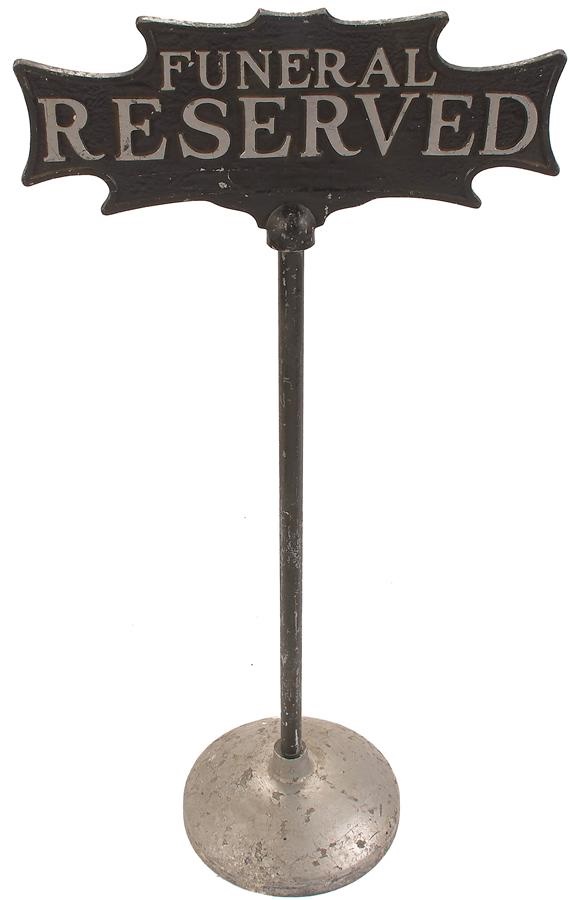 Lot # 1445: 1930s Cast Iron "Funeral Reserved" Sign & Original Stand