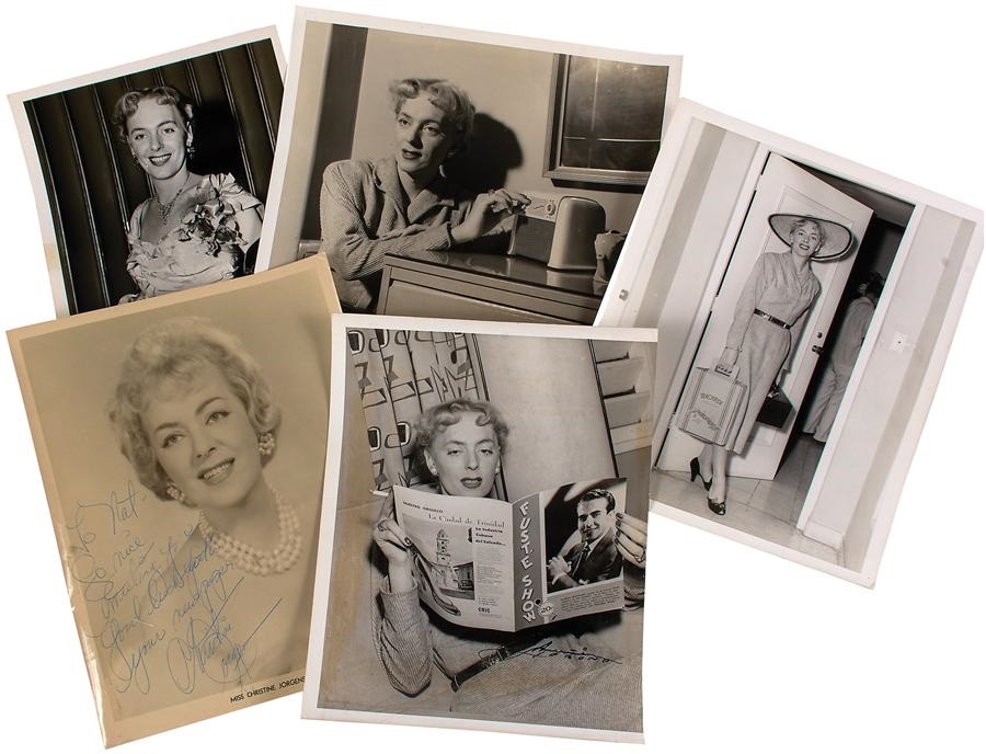 A small collection of vintage Type I photos of the first man to transform into a woman; Christine Jorgensen the first person ever to have sex reassignment surgery. Photos are from 1953 and vary in size from 7x9" through 8x10". The last photo (not a Type I) is inscribed "To Nat So nice meeting you. Good luck with your newspaper Christine Jorgensen." Three of the photos are EX-MT, one has the right border cropped off and the autographed photo has some wear.