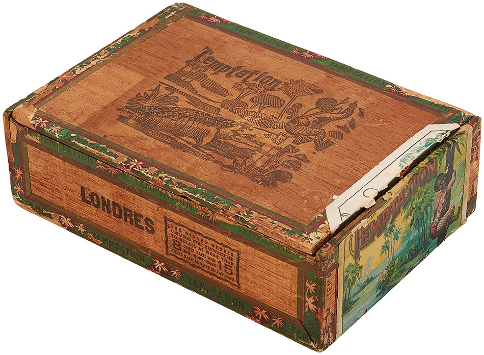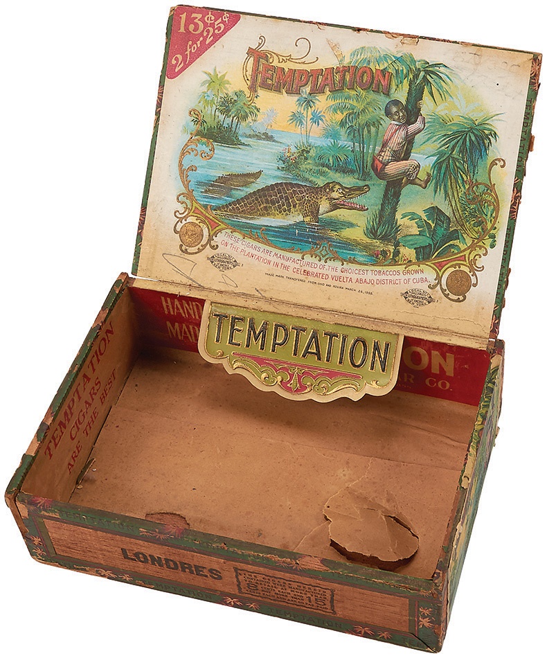 Like a great wine, objects of art such as this only get better with age. Easily the best cigar box we've ever seen, this late 19th Century curio is distinguished by African-American stereotypes and a rare inner pop-up die-cut inside. This was purchased for well over $1,000. There is an 1896 patent, which does not represent the exact year but right after that. There are some marks and scars but the color is good and it is overall very pleasing to the eye.